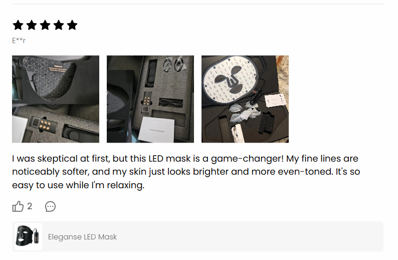 The Eleganse phototherapy mask is non-invasive and painless. The mask emits a soft glow, and you may feel a soothing warmth on your skin. Most users describe the sensation as very calming. The overall experience feels like a mini spa treatment at home!